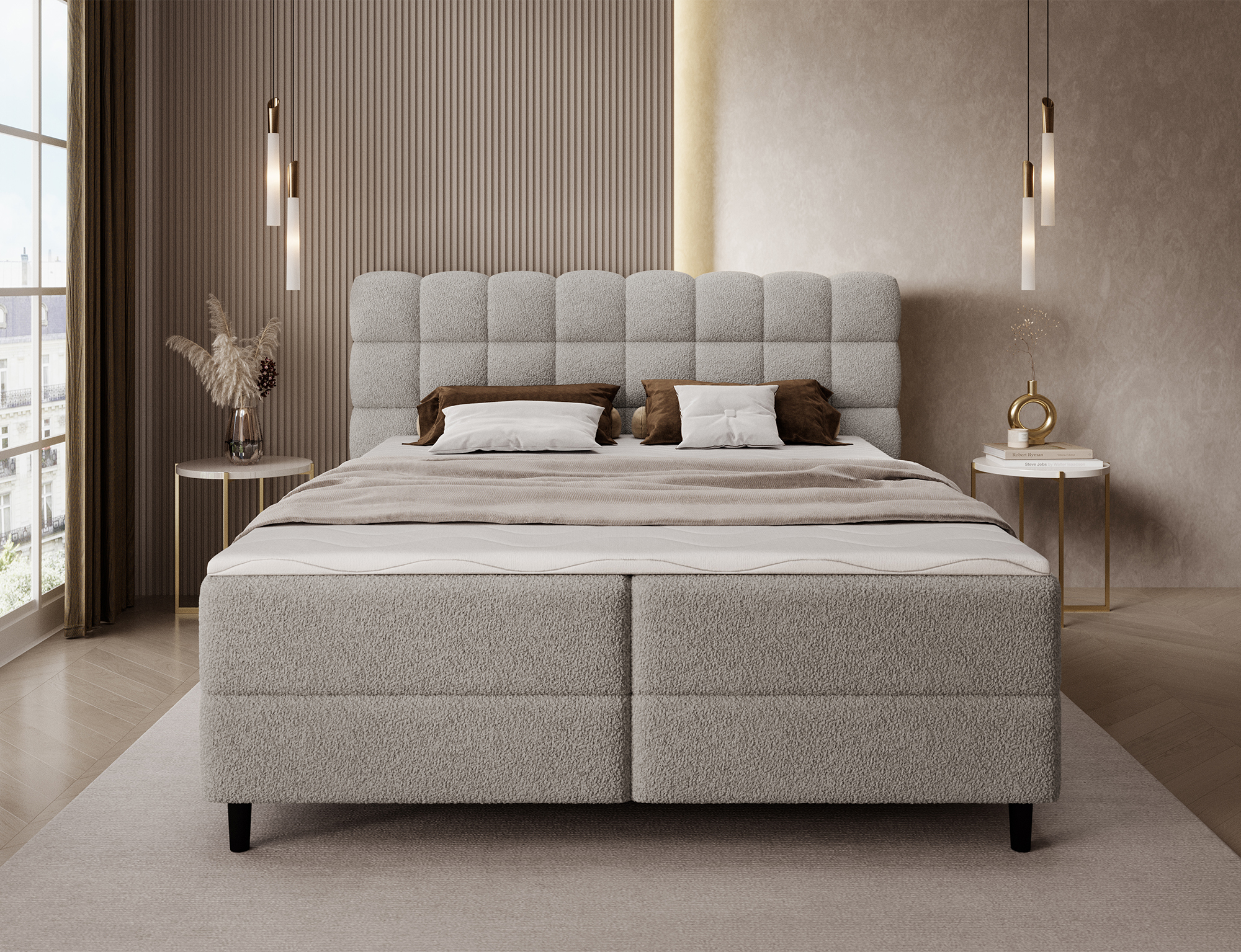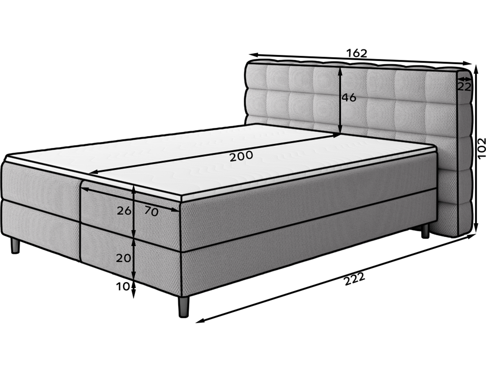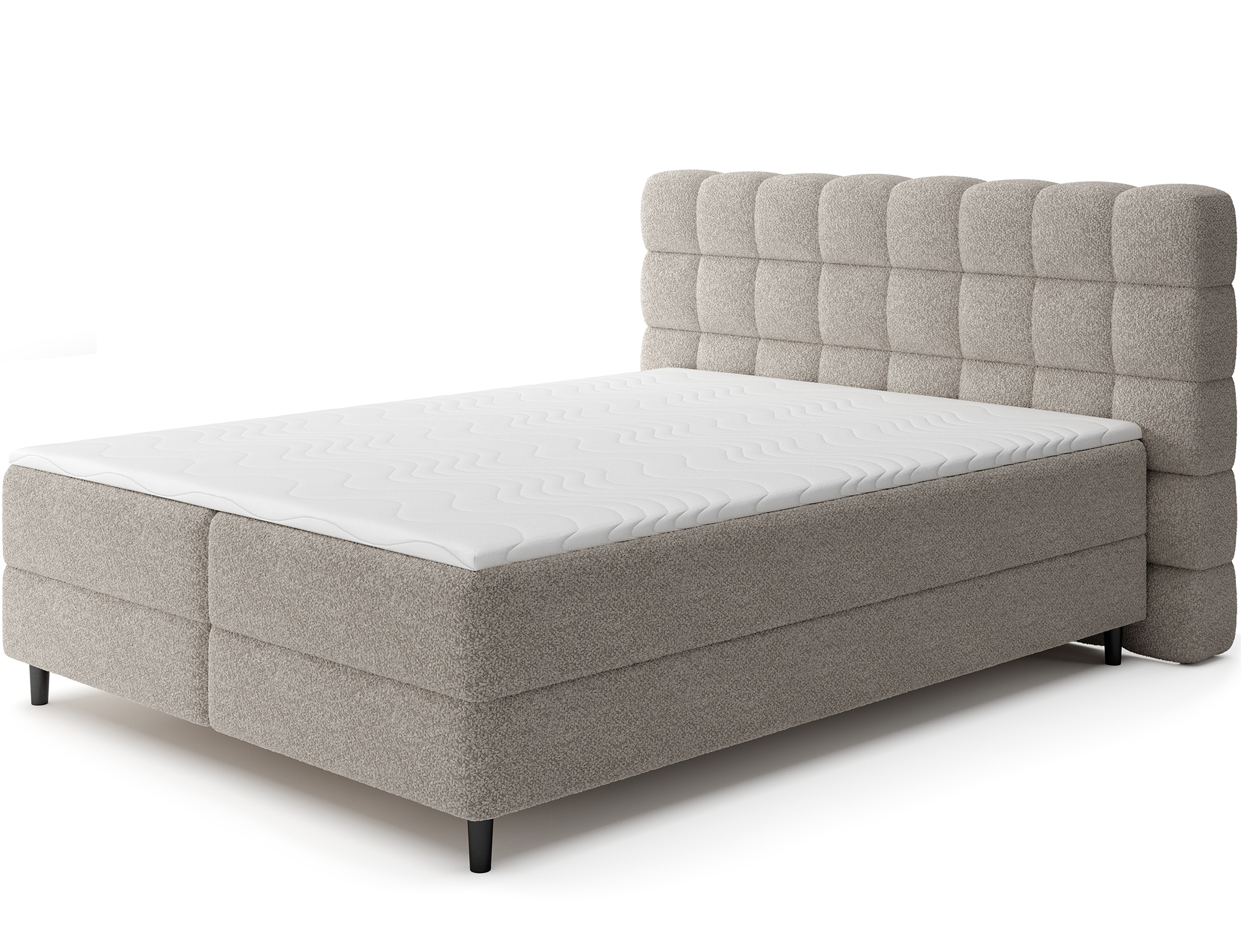 Das Boxspringbett Camma vereint modernes Design, Funktionalität und Schlafkomfort und eignet sich perfekt für ein elegantes und praktisches Schlafzimmer; erhältlich in drei Größen – 140×200 cm, 160×200 cm und 180×200 cm – ermöglicht es eine ideale Anpassung an den Raum und die Bedürfnisse der Nutzer, während die solide Konstruktion mit einer Gesamthöhe von 102 cm und einer Sitzhöhe von 56 cm täglichen Komfort garantiert; die Tiefe des Bettes beträgt 222 cm, und die Breite hängt vom gewählten Modell ab – 162 cm, 182 cm oder 202 cm – wodurch das Bett stabil und massiv wirkt und den prestigeträchtigen Charakter des Interieurs unterstreicht; bezogen mit einem hochwertigen Stoff mit angenehm strukturierter Oberfläche zeichnet es sich durch ein ästhetisches Kopfteil mit effektvoller Steppung aus, das ihm moderne Eleganz verleiht und gleichzeitig die ideale Stütze für abendliche Entspannung bietet; der praktische Bettkasten ermöglicht Ordnung im Schlafzimmer und eine optimale Raumnutzung, wodurch das Bett Camma nicht nur komfortabel, sondern auch äußerst funktional ist; schwarze Holzfüße mit einer Höhe von 10 cm verleihen der Konstruktion Leichtigkeit und erleichtern die Reinigung unter dem Bett; das Modell Camma ist die ideale Wahl für Menschen, die modernen Stil, Eleganz, Langlebigkeit und Komfort schätzen und einen gesunden, erholsamen Schlaf genießen möchten.