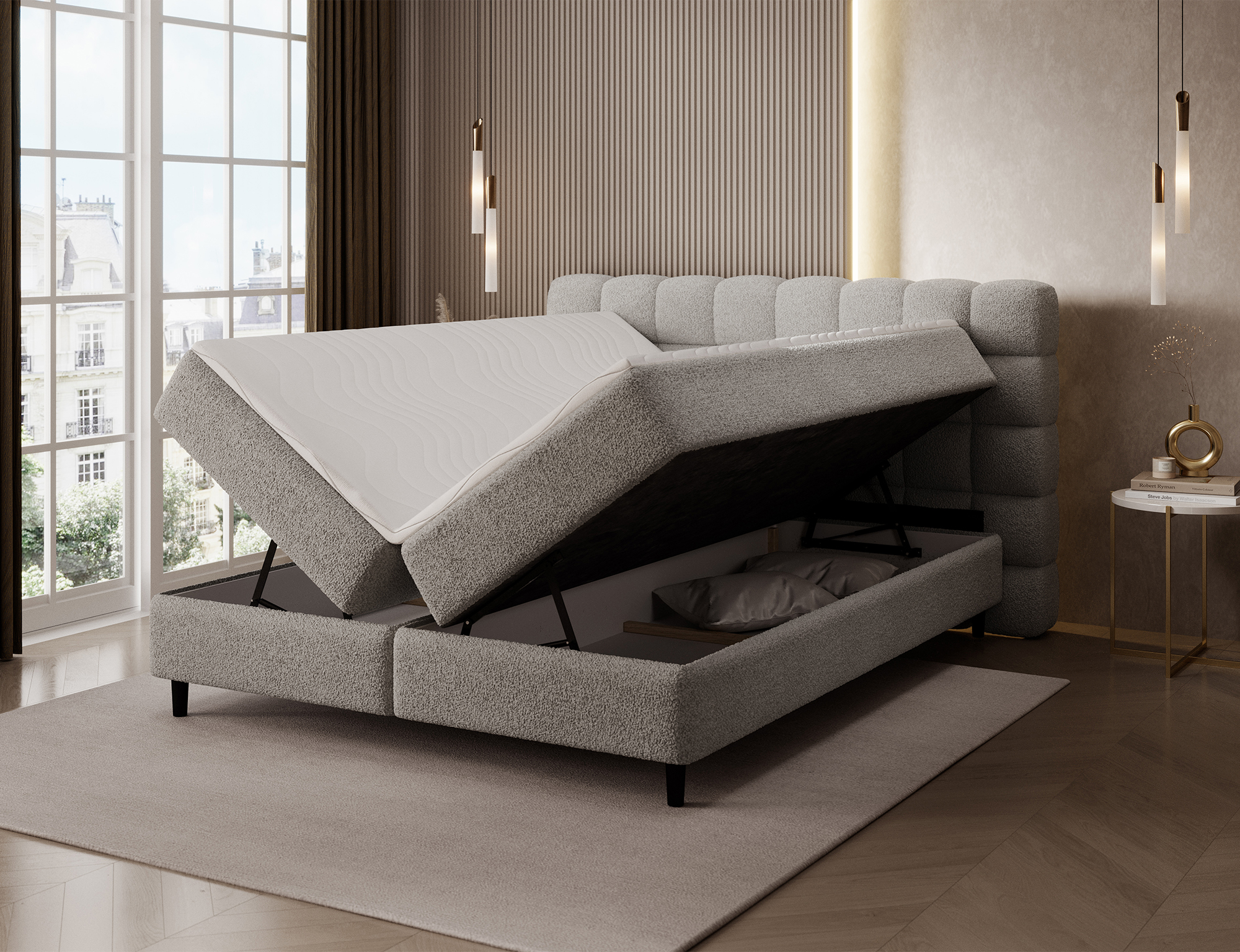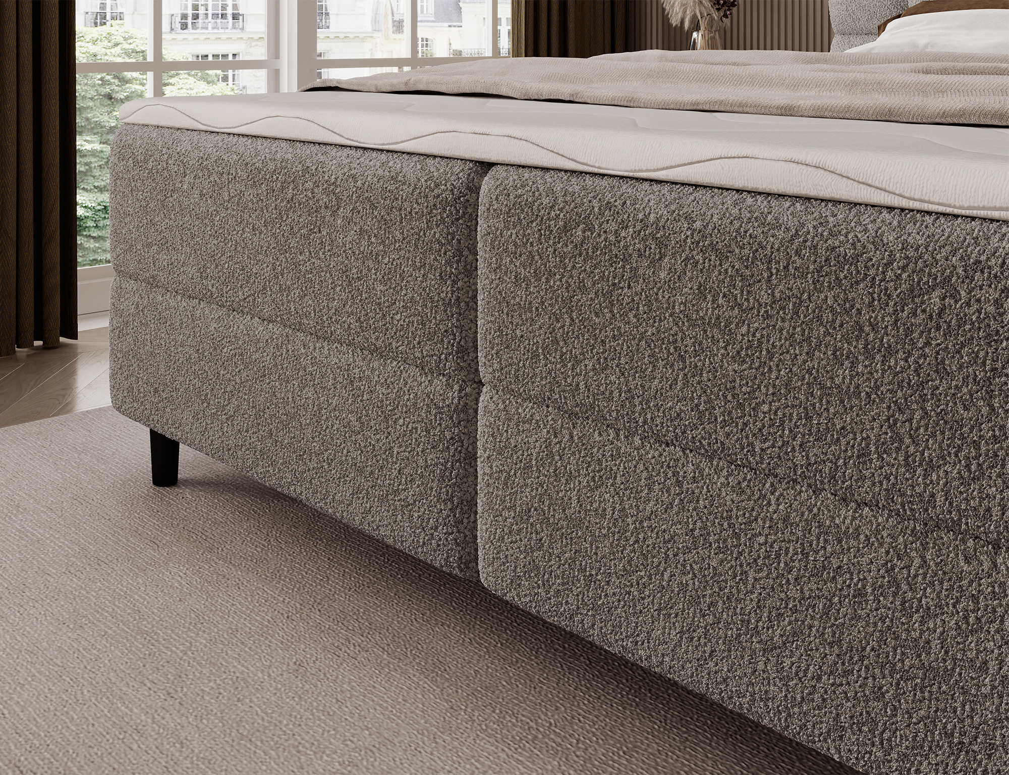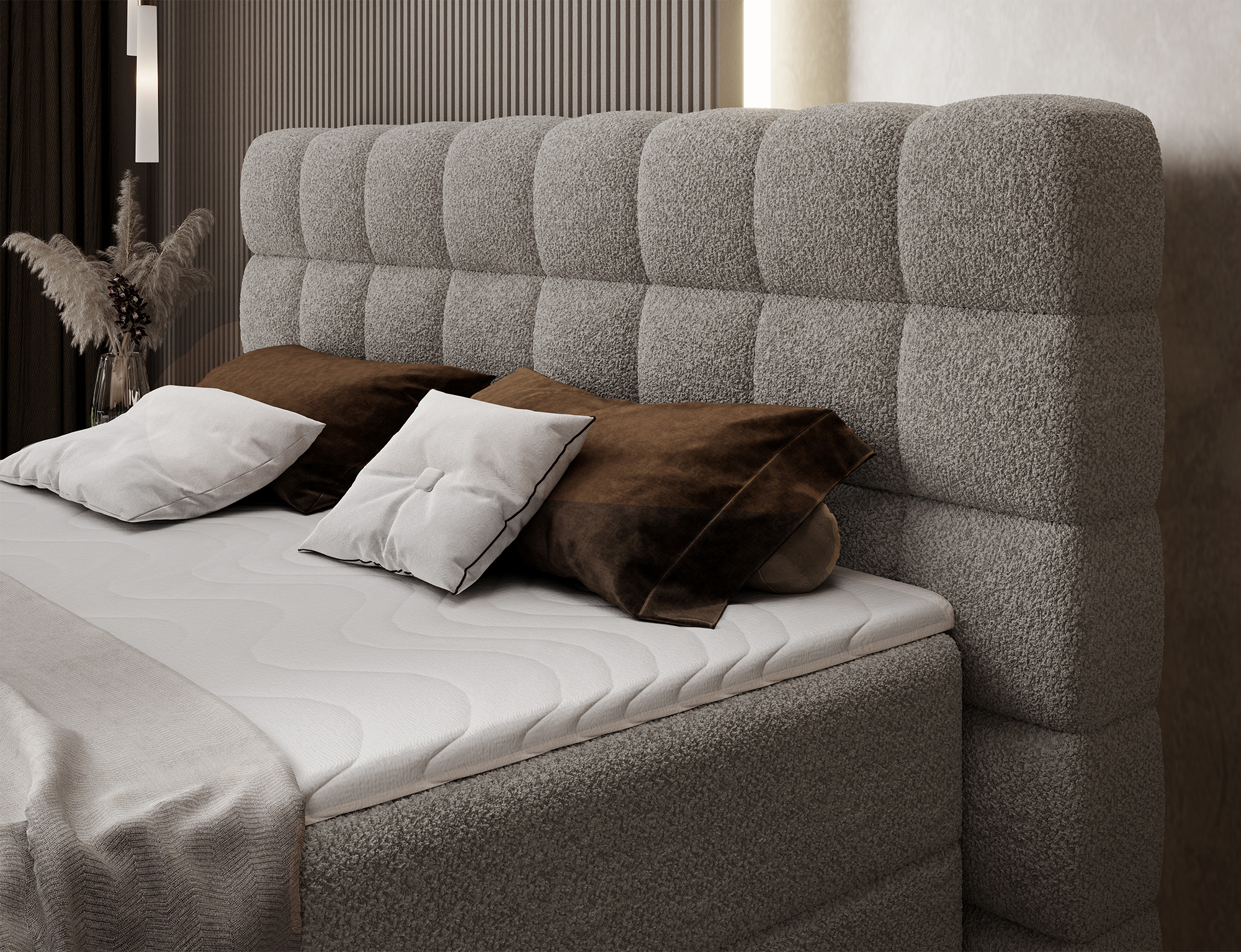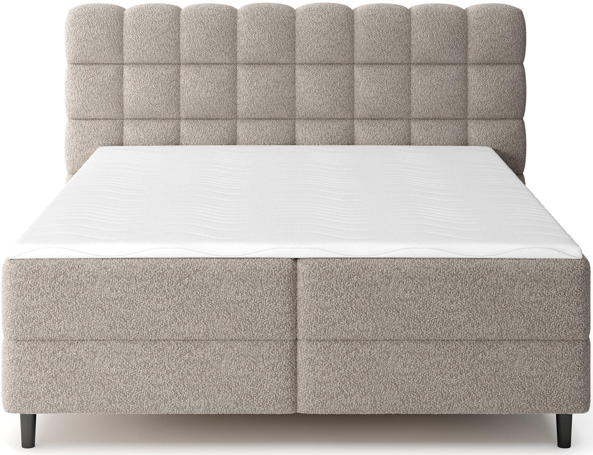 Das Boxspringbett Camma vereint modernes Design, Funktionalität und Schlafkomfort und eignet sich perfekt für ein elegantes und praktisches Schlafzimmer; erhältlich in drei Größen – 140×200 cm, 160×200 cm und 180×200 cm – ermöglicht es eine ideale Anpassung an den Raum und die Bedürfnisse der Nutzer, während die solide Konstruktion mit einer Gesamthöhe von 102 cm und einer Sitzhöhe von 56 cm täglichen Komfort garantiert; die Tiefe des Bettes beträgt 222 cm, und die Breite hängt vom gewählten Modell ab – 162 cm, 182 cm oder 202 cm – wodurch das Bett stabil und massiv wirkt und den prestigeträchtigen Charakter des Interieurs unterstreicht; bezogen mit einem hochwertigen Stoff mit angenehm strukturierter Oberfläche zeichnet es sich durch ein ästhetisches Kopfteil mit effektvoller Steppung aus, das ihm moderne Eleganz verleiht und gleichzeitig die ideale Stütze für abendliche Entspannung bietet; der praktische Bettkasten ermöglicht Ordnung im Schlafzimmer und eine optimale Raumnutzung, wodurch das Bett Camma nicht nur komfortabel, sondern auch äußerst funktional ist; schwarze Holzfüße mit einer Höhe von 10 cm verleihen der Konstruktion Leichtigkeit und erleichtern die Reinigung unter dem Bett; das Modell Camma ist die ideale Wahl für Menschen, die modernen Stil, Eleganz, Langlebigkeit und Komfort schätzen und einen gesunden, erholsamen Schlaf genießen möchten.